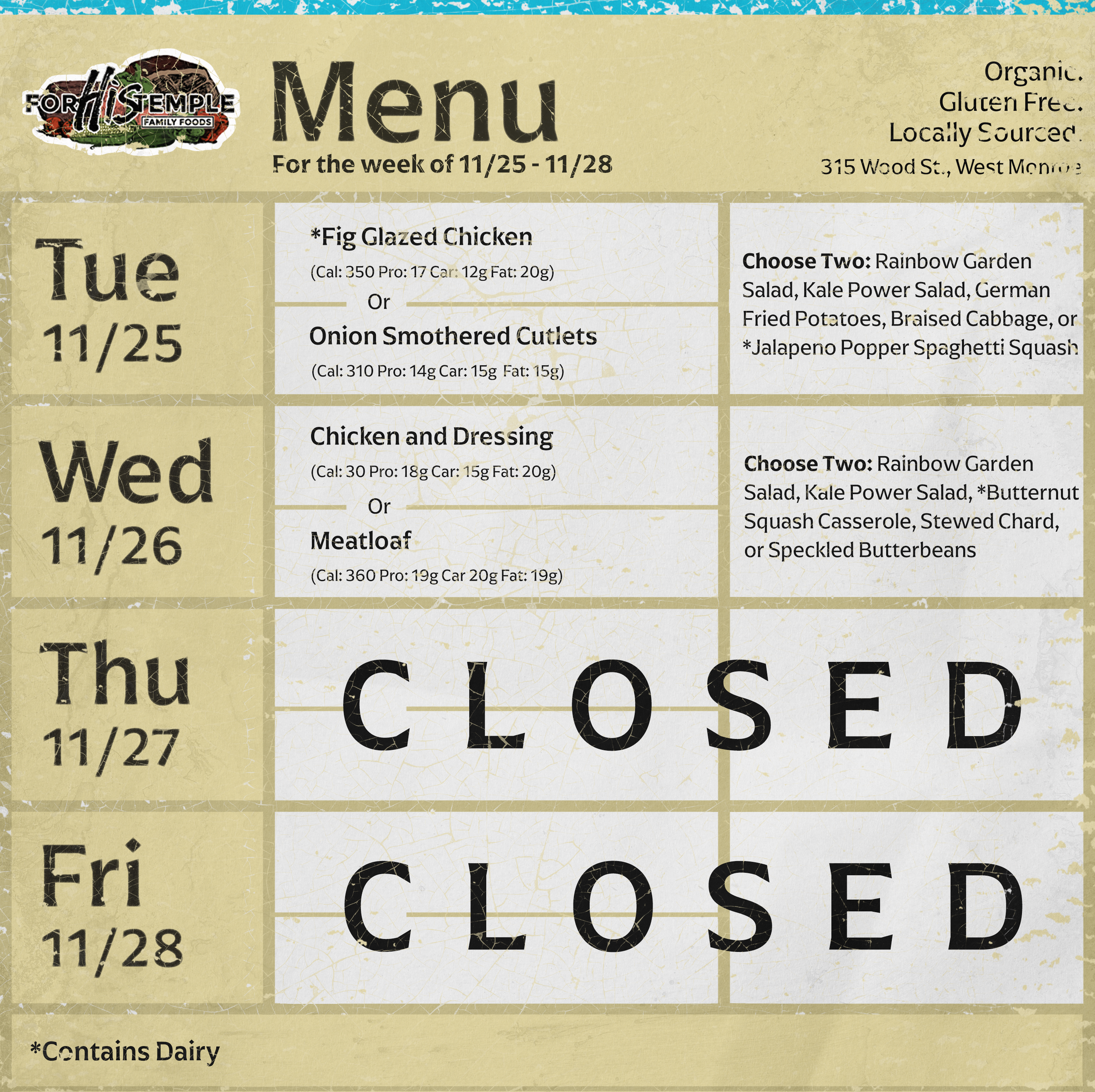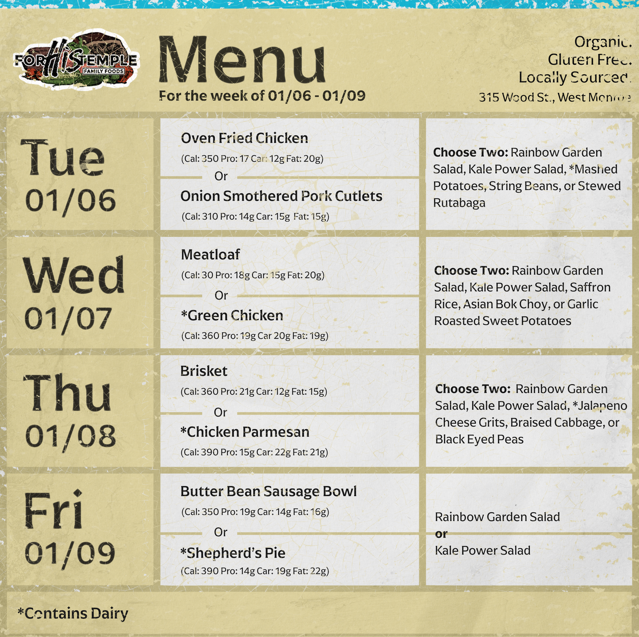 for His temple family foods prepares and serves lunch specials daily. Our menu changes each week! Every week we will post the menu of what we're serving here as well as on our Instagram and Facebook. Take a peek, start drooling, and decide to come in on your lunch hour to dine-in or grab it to go when you’re out running errands. You can call ahead (318-791-5956) to make sure your lunch is ready! Remember, we serve lunch from 11:00-2:00!