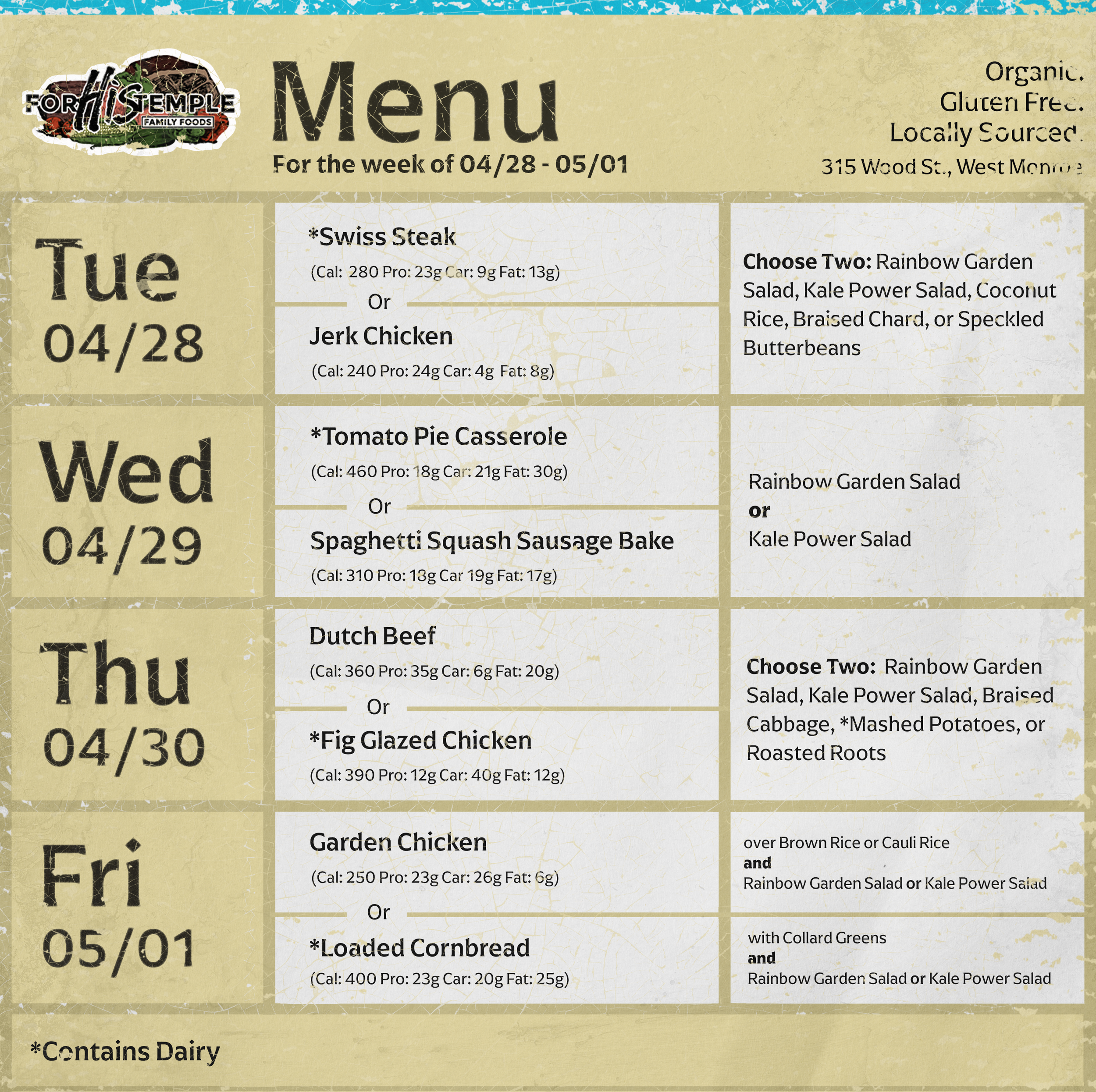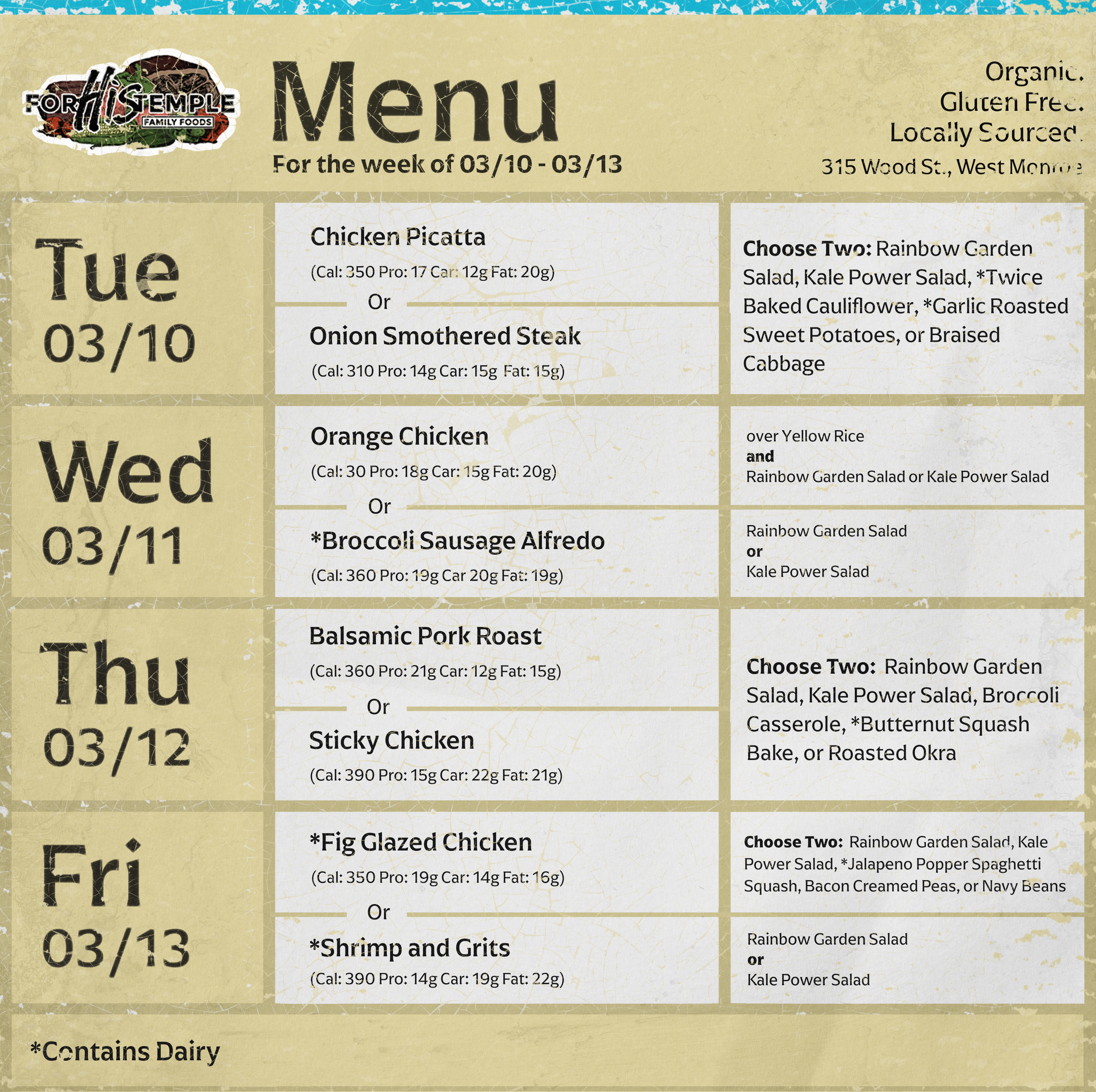 for His temple family foods prepares and serves lunch specials daily. Our menu changes each week! Every week we will post the menu of what we're serving here as well as on our Instagram and Facebook. Take a peek, start drooling, and decide to come in on your lunch hour to dine-in or grab it to go when you’re out running errands. You can call ahead (318-791-5956) to make sure your lunch is ready! Remember, we serve lunch from 11:00-2:00, Tuesday through Friday!